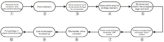 (2) We used a randomised within-subject study design. The study consisted of five sessions, separated by at least 72 h for each participant, to avoid potential carry-over effects (Figure 3). The participants were admitted to the laboratory at noon (approximately 3.5–5 h after waking up). The laboratory had been set up to simulate the external environment of the hygiene area of the space station to ensure that the participants had an appropriate environmental experience before they entered the simulated hygiene area. After connecting the T-Sens RF sensor, the HR sensor and the GSR sensor to each participant, the participants were exposed to dim (<6 lx) polychromatic white light for 5 min to relieve emotions [48,49]. After the adaptation period, the HR and GSR of the 40 participants in the five CCT lighting environments were recorded for about 15 min. The 15-min experiment length was chosen because, typically, the average time spent by astronauts while performing hygiene area manipulation behaviours is around 15 min. Had the length of the experiments been too long or too short, it would not have reflected the crew’s experience in that environment well. There are, however, some CCT lighting studies that arrived at significant results with shorter experiment lengths [50,51]. During the experiments, the participants strictly followed the processes for operating and using the urine/stool collector; the specific operation steps are shown in Figure 4. This was followed by the completion of the PANAS and CCTSV questionnaires. For each participant, the order of the CCT conditions was randomised to avoid potential sequence effects. At the end of the test, the participants rested in a D65 light environment for ten minutes and then left the laboratory.