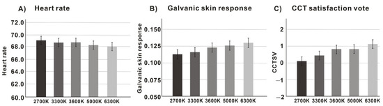 Comfortable CCT can increase satisfaction and happiness. Veitch (2001) found that office lighting conditions affect positive mood and happiness [27]. People working in offices with higher-quality lighting found the space more attractive, were in a happier mood and showed a significant sense of well-being. In addition to subjective emotional responses, a range of physiological responses have also been associated with the CCT characteristics of lighting. These include, e.g., core body temperature, heart rate, brain waves, galvanic skin response (GSR) [28,29,30], rectal temperature [31] and melatonin suppression. Previous studies have demonstrated that short-wavelength light has a greater effect on core body temperature and heart rate than long-wavelength light [32]. The reason for this phenomenon is that CCT can influence hypothalamic activity, which regulates and controls body temperature through the secretion of melatonin [33].