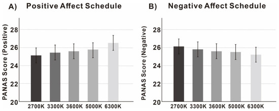 Turning to the affect scales, and starting with positive affect, there was a significant effect of CCT (F = 12.703, p = 0.046 < 0.05). The data is illustrated in Figure 6B. Positive affect was significantly higher in the 6300 K condition compared to the other four CCT conditions (p = 0.048 < 0.05). There was no significant difference between the other four CCT conditions (p = 0.078 > 0.05). It is clear from the data that the higher the CCT, the better the positive emotion, although this was not significant. Besides, we also found a non-significant main effect of CCT on negative emotion (F = 5.147, p = 0.083 > 0.05). However, the data showed that the higher the CCT, the lower the negative emotion, with the highest negative emotion at 2700 K and the lowest negative emotion at 6300 K.