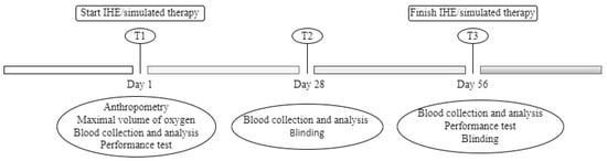 We followed the World Anti-Doping Agency (WADA) regulations when collecting and transporting the samples []. All of our samples were collected under baseline conditions and on an empty stomach, with a period of at least 12 h of fasting since the last meal. All of the blood samples were taken at 08:30 and all of the participants were resting comfortably in a sitting or lying position. The participants were called to the laboratory at 8:30 a.m. on three specific days throughout the study: at the baseline (T1), day 28 (T2), and day 56 (T3) (as shown in Figure 1). The vacutainer system was used (10 mL for serum and 5 mL and 3 mL for EDTA). Immediately after extraction, the tubes were inverted 10 times and were placed in a sealed box to be stored at 4 °C. The temperature during transportation was controlled using a specific label (Libero Ti1, Elpro, Buchs, Switzerland), which was used to measure and register the temperature. The samples were transported under suitable conditions, and they arrived at the laboratory 30 min after extraction. Delays did not affect the analytical quality of the parameters that were studied. The EDTA (anti-coagulant) samples were homogenized for 15 min before being analyzed, as recommended by the WADA.