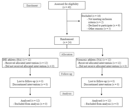 In total, 40 athletes were initially recruited; however, nine athletes decided not to participate in the study. The remaining 31 athletes underwent the VO2 max test, of which five were excluded for presenting results that could distort the homogeneity of the sample. These five athletes had just overcome musculoskeletal injuries and were therefore not physically fit enough to follow the training program without risking relapse. In addition, two other athletes were excluded because they were taking drugs that could alter their hematological biomarkers. Overall, 24 athletes were included in the study and were randomly divided into two groups by means of a stratified block design: the hypoxic intervention group (HA; n = 12) and the normoxic control group (NA; n = 12). None of the 24 participants dropped out of the study or interrupted the intervention, so all participants were tested at T2 and T3 (Figure 2).