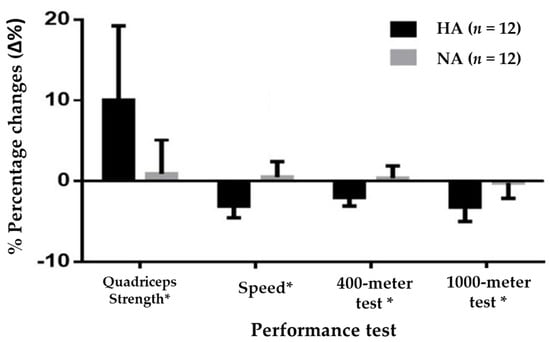 The percentage changes in the performance test results are presented in Figure 3 (quadriceps strength (HA: 10.04 ± 9.21% vs. NA: 0.92 ± 4.22%), speed (HA: −3.09 ± 1.44% vs. NA: 0.51 ± 1.90%), 1000 m test (HA: −3.21 ± 1.80% vs. NA: −0.022 ± 1.91%), and 400 m test (HA: −2.04 ± 1.06% vs. NA: 0.35 ± 1.53%)). Significant differences (p < 0.05) were found between the percentages of changes in all tests for the HA group with respect to the NA group.