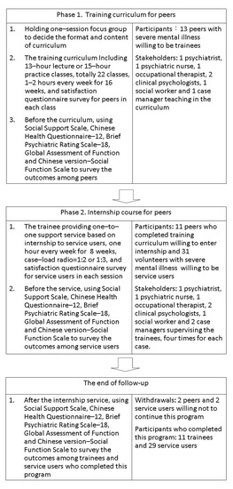 - Fan, Y.; Ma, N.; Zhang, W.; Xu, W.; Shi, R.; Cheng, H.; Lamberti, J.S.; Caine, E.D. Feasibility of peer support services among people with severe mental illness in China. BMC Psychiatry 2019, 19, 360. [Google Scholar] [CrossRef] [PubMed]