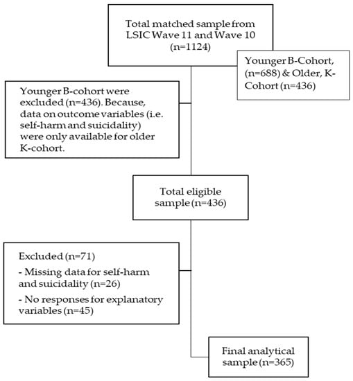 A flow chart for the selection of the analytical sample is presented in Figure 2. The current study included 365 Indigenous adolescents aged 13.5–15 years at the time of the latest LSIC Wave 11 in 2018. We included participants who provided complete data on the outcome variable (i.e., self-harm and suicidality) and exposure variables in our study. Participants who did not respond to the outcome or predictor variables were omitted (n = 71).