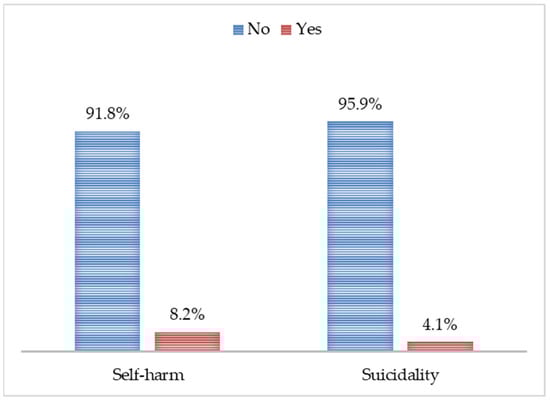 The proportion of adolescents who did not report a history of intentional self-harm was 91.8%, and the proportion of adolescents who did not report previous suicidality was 95.9%, shown for the study sample in Figure 3.