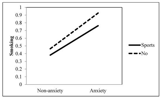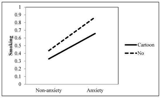 Hypothesis 2 predicted that the association between an anxiety disorder and the extent of smoking would be moderated by excitement-valenced entertainment television viewing, such that the effect of the positive association would be reduced when they watched excitement-valenced entertainment programs including comedy, cartoon, and sports. The regression analysis demonstrated that the effect of the positive association between an anxiety disorder and smoking was significantly attenuated when they watched cartoons (b = −0.170, p = 0.009) and sports (b = −0.124, p = 0.025), but not comedy (b = 0.090, p = 0.104) (see Table 1 and Figure 1 and Figure 2). Thus, H2 was partially supported.