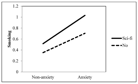 Research Question 1 investigated the role of ambiguously-valenced entertainment television viewing in the association between an anxiety disorder and smoking behavior. Our findings showed that the positive association between an anxiety disorder and smoking was significantly accentuated when they watched drama (b = 0.213, p = 0.002), music (b = 0.293, p < 0.001), and sci-fi (b = 0.170, p = 0.005) (see Table 1 and Figure 3, Figure 4 and Figure 5). However, movies did not moderate the association between an anxiety disorder and smoking (b = −0.129, p = 0.051).