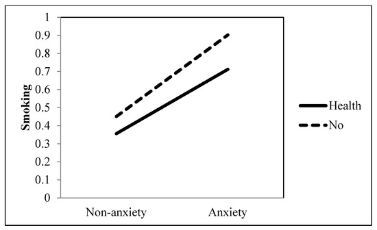 Research Question 2 investigated the role of informational television viewing in the association between an anxiety disorder and the extent of smoking. Results indicated that the strength of the positive association between an anxiety disorder and the extent of smoking was significantly intensified when they watched television news (b = 0.124, p = 0.035) (see Table 1 and Figure 6). In contrast, the strength of the positive association between an anxiety disorder and the extent of smoking was significantly reduced when they watched health information programs (b = −0.183, p = 0.014) (see Table 1 and Figure 7).