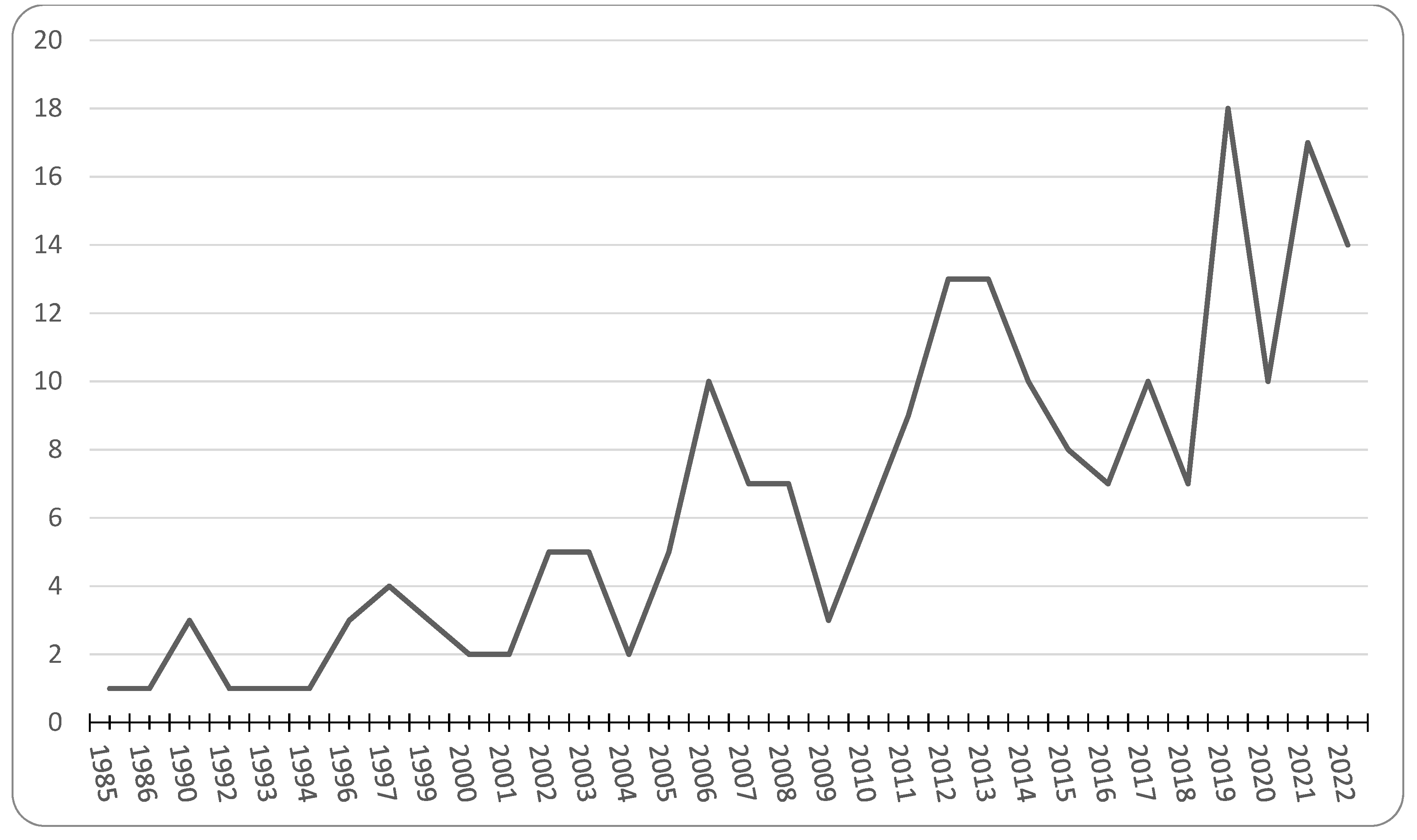 Number of Publications Comparing native- and foreign-born Blacks, By Year.