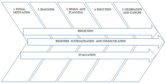 Students were grouped to design and carry out their projects in groups of four to six students. Each group could work with a different social organization, each of them attending a specific type of population (the specifications regarding each social organization are clearly described in the subsequent section of the paper). In order to properly carry out a project, it is necessary to follow some guidelines that the groups had to apply in their specific contexts. Specifically, their projects followed the model proposed by CLAYSS [40] (Figure 1).