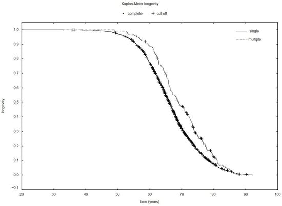 | Non-smokers’ total survival time (years) | 68.28; 11.74; 68.67; 69 | 70.17; 10.17; 68.39; 58 | 0.336 (1) | 67.40; 12.40; 67.35; 56 | 69.65; 10.08; 69.65; 50 | 0.310 (1) | 72.06; 7.54; 72.31; 13 | 73.44; 10.79; 67.28; 8 | 0.799 (2) | 68.46; 11.37; 68.25; 106 | 72.58; 8.68; 69.64; 21 | 0.136 (2) |