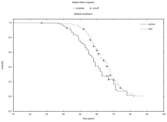 | Multiple neoplasms—women (1) | 66.32; 8.48; 66.32; 33 | 66.82; 6.11; 66.79; 24 | 72.06; 7.54; 72.31; 13 | 0.065 |