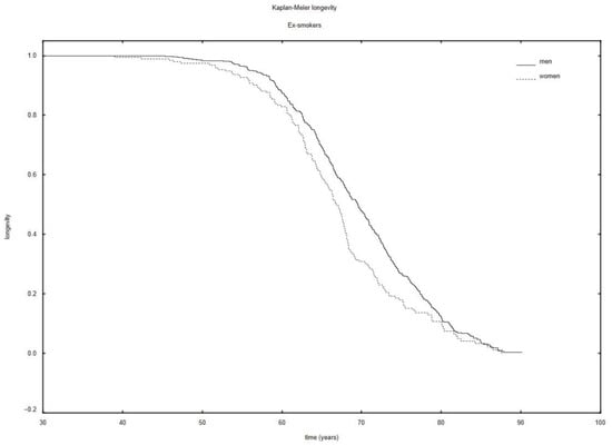| Ex-smokers’ survival time (years) | 66.14; 8.40; 66.36; 194 | 68.89; 8.05; 68.53; 484 | 0.000 (2) | 66.05; 8.69; 66.33; 170 | 68.28; 8.06; 67.85; 411 | 0.007 (2) | 66.82; 6.11; 66.79; 24 | 72.32; 7.11; 73.22; 73 | 0.001 (1) | 67.63; 8.30; 67.33; 581 | 70.96; 7.25; 71.51; 97 | 0.000 (2) |