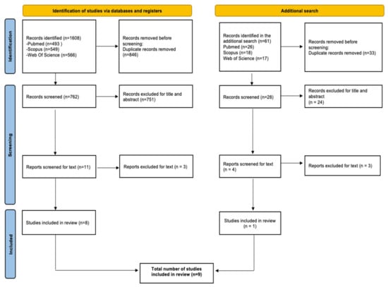 A total of 1608 records were identified from the database search. Duplicates (n = 846) were removed, leaving 762 articles to be judged for relevance. Of those, 751 were excluded, leaving 11 records whose full text was screened. After evaluation, eight studies were included in the first step of the review (Figure 1). The same screening process was then replicated in the context of a second search performed a few months later, which yielded a total of n = 1 article. Details on the second screening process are also reported in Figure 1. In total, n = 9 articles were included in this review. Among the included studies, five studies [23,24,25,26,27] were conducted in the United States, two [28,29] in Japan, one in Taiwan [30], and one in Canada [31]. The most recent studies were published in 2021–2022 [23,26,27,31], and two more were published in the years 2017 and 2018 [28,29], while the remaining three were published before 2013 [24,25,30]. Five of the included studies [23,26,27,30,31] refer to slow-onset disasters (i.e., epidemics), while the other four [24,25,28,29] refer to sudden-onset disasters (i.e., earthquake, chemical spill). Two studies [25,30] used interrupted time series analysis, two [23,24] were conducted as a pre-/post-test study, three had a cross-sectional design [26,27,28], and two had a retrospective cohort or population-based design [29,31]. All studies were aimed at assessing the impact of disasters on ACSC hospitalization rates, except for Wright et al. (2021), which compared health care use and costs of individuals enrolled in Medicaid before the COVID-19 pandemic vs. those enrolled in Medicaid during the first COVID-19 wave. A breakdown of the full characteristics of the included studies is listed in the (Supplementary File S3).
