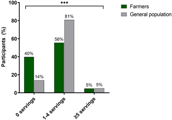 Concerning food intake, farmers ate less servings of fruits/day (0.9 (SD: 0.9) vs. 1.1 (SD: 0.9) (p < 0.001)) and vegetables (0.08 (SD: 0.8), 1.0 (SD: 0.7); p < 0.001) in comparison to the general population. In other words, one in three farmers reported not consuming any F&V daily, compared to one in seven of the general population. Only 4.8% of the farmers as well as 5.0% of the general population consumed the recommended five servings or more per day (Figure 1). On average, above half of the farmers and 80% of the general population reported eating between one and four servings of F&V/day (Figure 1).