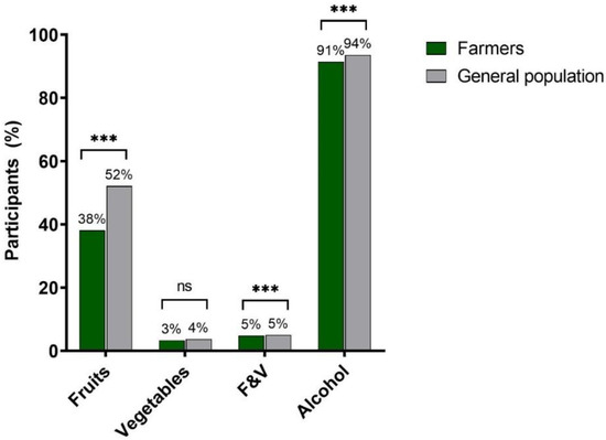 Participants’ percentage of recommendations’ fulfillment for fruit, vegetables, and alcohol. Notes: n.s. not significant; *** significant differences, which were calculated using Chi-Square Tests. To assess the fulfillment of the recommendations concerning F&V, cut-offs of ≥1–2 x/day and ≥3–4 x/day were used, respectively [4,5]. For alcohol, the recommendations of <2 drinks/day for men or <1 drink/day for women were used [6].