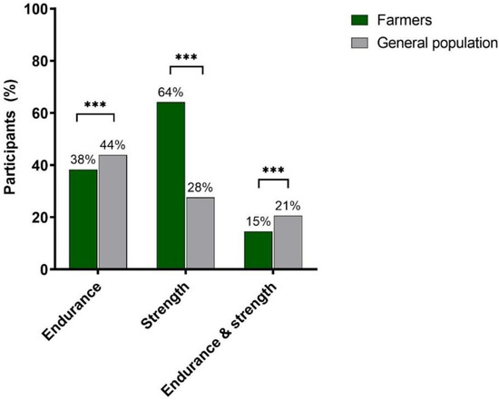 Concerning PA, farmers reported significantly less endurance training participation, and 38% met the recommendations of ≥150 min/week. For strength training, farmers were more likely to meet the recommendations than the general population. Overall, one in seven farmers reported performing endurance training ≥150 min/week and strength training ≥2 x/week, compared with one in five in the general population (Figure 3).