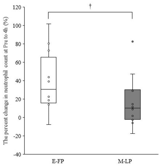 Difference in the percent change in neutrophil counts from pre- to 4 h postexercise in the early follicular phase group (E-FP) and mid-luteal phase groups (M-LP) (median and interquartile range); †, The M-LP tended to be lower than the E-FP (p = 0.068; effect size = 0.377).