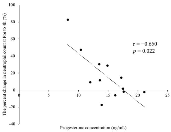 Significant negative correlation observed between the progesterone concentration and percent change in neutrophil counts from pre- to 4 h postexercise in the mid-luteal phase group.