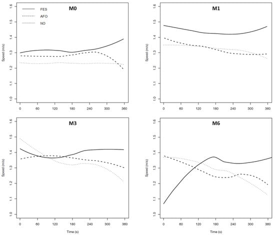 The 6-MWT distance increased from M0 to M1, M3, and M6 in NO, AFO, and FES conditions (Table 1), but the difference was not clinically significant (<28 m) [18,19]. On the other hand, the trajectories of the gait speed during the 6-MWT clearly showed that the speed decreased throughout the test in NO and AFO conditions, while the speed increased in the FES conditions at M0, M1, M3, and M6 (Figure 1).
