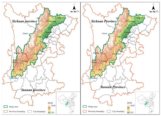 The SYEB is part of the Sichuan–Yunnan-loess plateau ecological barrier and is a key component of China’s ecological security strategic patterns. The SYEB is located in the Hengduan Mountains and the transition zone from the Yunnan–Guizhou Plateau to the Qinghai–Tibet Plateau, wherein the topography is decreasing from northwest to southeast and the ecological environment is relatively fragile (Figure 1). This region is dominated by plateau mountain temperate and subtropical monsoon climate, with annual precipitation of 500–1400 mm, and the average annual temperature in the region can vary by more than 20 °C [30]. The SYEB has a special ecological status and plays an important role in soil conservation, water conservation, and biodiversity maintenance.