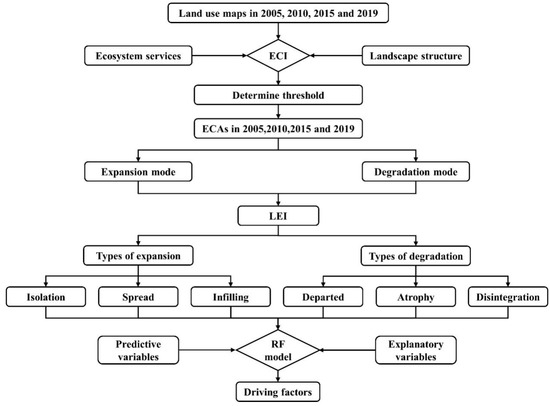 This study constructs ECI to identify ECAs in the SYEBZ during 2005, 2010, 2015, and 2019. Then, the LEI was used to delineate the specific types of ECA expansion and degradation modes during three periods, namely 2005–2010, 2010–2015, and 2015–2019. Finally, the RF model was used to explore the spatiotemporal heterogeneity of drivers of ECA evolution modes and specific types.