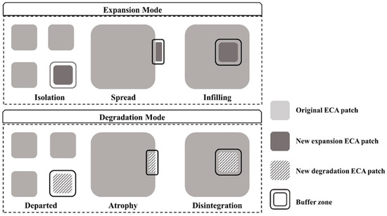 According to the definition of LEI [39], we have defined six types of ECA evolution. The expansion mode has three specific types: (1) if the buffer of a new ECA patch consists of non-ECA only (LEI = 0), it is classified as the isolation type, implying that the new ECA patch is spatially discontinuous with the original ECA patch; (2) if the buffer of a new ECA patch consists of non-ECA mixed with original ECA (0 < LEI ≤ 50), it is classified as the spread type, meaning that the new ECA patch is located at the edge of the original ECA patch; and (3) if the buffer of a new ECA patch is mostly occupied by the original ECA (50 < LEI ≤ 100), it is classified as the infilling type, indicating that the new ECA patch is located within the original ECA patch. The degradation mode also has of three specific types, namely departed, atrophy, and disintegration. Their classification rules correspond to the specific type of expansion mode.