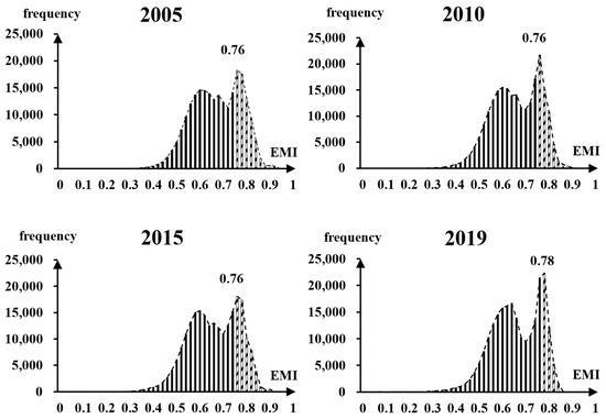 By counting and plotting the frequency distribution of ECI during 2005, 2010, 2015, and 2019, we observed that the frequency distribution of ECI in each period is similar. By comparing the extraction results of different thresholds, including peak, trough, and inflection point, we finally chose the last peak of the trend line as the extraction threshold (T) of ECA (Figure 4). Therefore, the grids with ECI > T were identified as ECA, whereas those with ECI < T were identified as non-ECA.