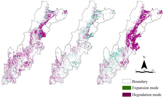 Through the spatial analysis, we divided the ECA evolution into two modes: expansion and degradation. Grids that were previously identified as non-ECA and later identified as ECA are called expansion. By contrast, grids that were previously identified as ECA and later identified as non-ECA are called degradation (Figure 3).
