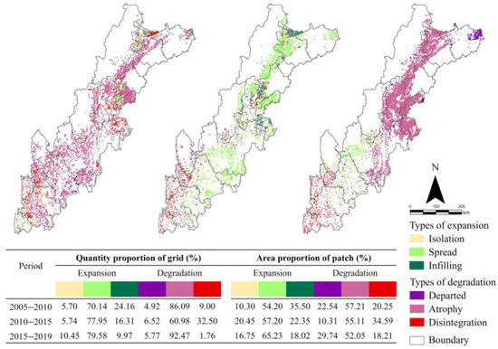 Atrophy is the predominant type among the three specific types of the degradation mode (Figure 7), indicating that degradation also mainly starts at the edge of the original ECA. In the last 15 years, for the departed type, the proportion of grid count increased from 4.92% to 5.77%, and the proportion of patch area increased from 22.54% to 29.74%, indicating that the spatial distribution of departed type tends to be more dispersed. For the atrophy type, the proportion of grid count increased from 86.09% to 92.47%, and the proportion of patch area decreased from 57.21% to 52.05%, indicating that the spatial distribution of the atrophy type tends to be more concentrated. Finally, for the disintegration type, the proportion of grid count decreased from 9.00% to 1.76%, and the proportion of patch area decreased from 20.25% to 18.21%, indicating that the distribution of this type tends to be more dispersed.