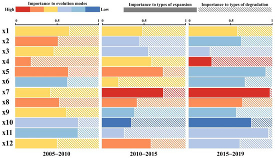 In terms of socioeconomic factors, the importance level of area of cropland (x7) was IV in 2005–2010, which increased to VI during 2010–2015 and 2015–2019, indicating that the impact of artificial ecosystems is gradually increasing. The importance level of GDP (x8) was stable, with it being V in all three periods. The importance level of population (x9) decreased from IV in 2005–2010 to II in 2010–2015 and 2015–2019. The importance level of nightlight (x10) also showed a downward trend, decreasing from level III in 2005–2010 to level I during 2010–2015 and 2015–2019, indicating the importance of the economic output. Owing to urbanization, rural population and economic activities are gradually being concentrated in cities; hence, the importance of human activity gradually decreased. The importance level of distance from impervious (x11) showed a fluctuating trend, increasing from IV in 2005–2010 to V in 2010–2015 and then decreasing to III in 2015–2019. The importance of distance from cropland (x12) has increased from level II in 2005–2010 to level III in 2010–2015 and 2015–2019. The Chinese government has proposed a ‘new urbanization’ policy to alleviate the ecological pressure caused by rapid urbanization; therefore, the impact of urban expansion first increased and then decreased. In addition, due to the implementation of the Cropland Balance Policy, cropland will gradually move out with urban expansion.