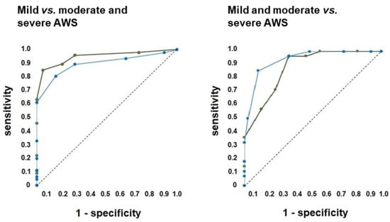 Diagnostic ability of AST scale. The figure shows Receiver Operating Characteristics of AST scale during discriminating mild AWS vs. moderate and severe AWS (left panel), as well as mild and moderate AWS vs. severe AWS (right panel). AST is shown in blue and GMAWS in green. Abbreviations: AWS, Alcohol Withdrawal Syndrome.