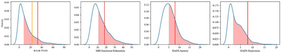 Distributions of pathological scores and cutoffs (vertical lines) for each of the scales (left to right) IES-R PTSD (clinical concern ≥ 24 in orange; 16% and positivity ≥ 33 in red; 9%), MBI Emotional Exhaustion (≥18), HADS Anxiety (≥8), HADS Depression (≥8) Scales. The red shaded area denotes where the upper 50% of police officers are situated (the median and above). The area to the right of the vertical lines designates pathology presence (e.g., ≥threshold).