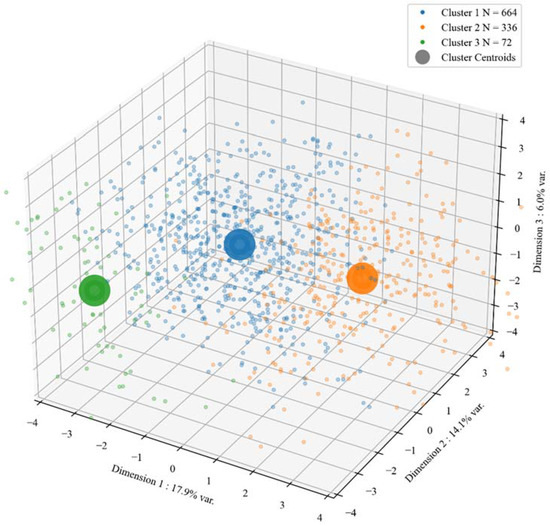 The clustering analysis revealed three well-defined clusters that balance interpretative parsimony and performance (separation and compactness). The resultant diagnostics were as follows: Davies-Bouldin score = 1.47 ([0, ∞+], lower values preferred), Calinski-Harabasz score = 241.11 ([0, ∞+], larger values preferred), Dunn Index = 1.49 ([0, ∞+], larger values preferred and average Silhouette score = 0.19 ([−1.0, 1.0], larger values preferred). The satisfactory result of within-cluster cohesion and between-cluster separation with respect to the three strongest principal components, as per the total variance they explained (17.9%, 14.1% and 6.0%, respectively) is visualised in Figure 2.