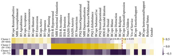 The clustering analysis may also permit one to take a look at the traits and strategies associated with reduced pathologies together, instead of separate analyses of each pathology. For example, based on the clustering analysis in Figure 3, for the majority of police officers who may be faced with stressful situations, the difference between Clusters 1 and 2 show that positive reinterpretation, sense of accomplishment, acceptance, sense of humour, active coping and planning were associated with the absence of clinical levels of the different pathologies and their subscales, such as for PTSD (IES-R), BO (MBI), anxiety (HADS), depression (HADS) and suicide ideation (BDI-2). The personality traits most associated with low levels of these were agreeableness, conscientiousness, and extraversion (B5). These results corroborate or summarise well those found in the previous separate analyses such as in the two-sample positivity t-tests and the separate linear and logistic regressions on PTSD and BO. Cluster 3 concerns a small sample who are insensitive to any variable except that they have a positive personality profile.