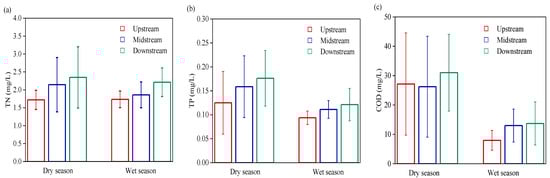 Temporal and spatial distributions of water quality features of the Wanggang River were shown in Figure 2. Pollutant concentrations in the Wanggang River during the dry season were higher than during the wet season. Temporally, the average TP concentration during the dry season was 0.15 mg/L, which was significantly higher than during the wet season (p < 0.01). Both dry and wet seasons met the surface water quality standard of class Ⅲ. The average COD concentration during the dry season was 28.00 mg/L, which was 2.3 times higher than that during the wet season (12.10 mg/L). On the whole, the wet season met surface water quality standard Ⅲ, and the dry season met surface water quality standard Ⅳ. The TN concentrations during the dry (2.07 mg/L) and wet seasons (1.94 mg/L) were not significantly different. On the whole, both dry and wet seasons met the water quality standard. Spatially, the average TN and TP concentrations in the lower reaches were 2.28 mg/L and 0.15 mg/L, respectively, both of which were higher than those in the upper and middle reaches. The average COD concentration in the lower reaches was 22.27 mg/L, which was 19% higher than in the upper reaches.