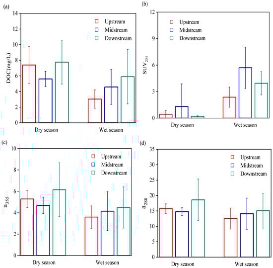 The DOM content in the water was characterized by DOC concentration. The average DOC concentration in the Wanggang River during the dry season was 6.92 mg/L, which was significantly higher than in the wet season (p < 0.01), both values were less than the primary discharge standard (20 mg/L). Overall, DOC concentration in the lower reaches was higher than in the other river sections. Figure 3b shows that SUVA254 in the water during the wet season was significantly higher; SUVA254 in the middle reaches of the Wanggang River was significantly higher than those in the upper and lower reaches during both wet and dry seasons (p < 0.01). In this study, a280 in water during the dry season was significantly higher than during the wet season (p < 0.05). Additionally, the average a355 in water during the dry season was 5.38, which was significantly higher than that during the wet season (p < 0.05).