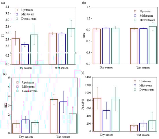 Figure 4 illustrates the variability in the fluorescence spectral parameters of the DOM in the Wanggang River. In terms of time, the FI of the Wanggang River was relatively high during the wet season (up to 3.43), and the FI values in both dry and wet seasons were greater than 1.9. The BIX showed no significant differences between the dry and wet seasons and was generally lower than 1, ranging between 0.8 and 1.0. Fn (280) during the dry season was significantly higher than that during the wet season (3.4 times; p < 0.01). Spatially, the FI of the lower reaches (2.64) was higher than the upper and middle reaches. The spatial distributions of HIX and Fn (280) were significantly different between the dry and wet seasons. The HIX of the middle reaches peaked (~1.47) during the dry season (HIX < 1.5); while the HIX of the upper reaches peaked (~3.66) during the wet season (HIX < 6). The Fn (280) of the middle reaches was lowest during the dry season and peaked in the upstream reaches during the wet season.