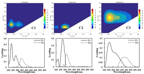 By calculating the FI, HIX, and BIX of DOM in the overlying water, the sources and properties of DOM were determined. All EEM fluorescence data were modeled by the PARAFAC method using the DOM Fluor toolbox in MATLAB R2016b (Mathworks, Natick, MA, USA), the detailed steps can be found in the method used by Wang et al. []. Fluorescence components were obtained based on half-split validation and random initialization. Their relative abundances (%) and ratios were determined based on maximum fluorescence intensities (Fmax). The principal components were extracted from the water quality factors related and DOM components using principal component analysis (PCA).The analysis of fluorescence spectrum parameters were shown in Table 2. The excitation and emission maxima of the fluorescent components of DOM identified in the overlying water by parallel factor (PARAFAC) modeling were shown in in Table 3.