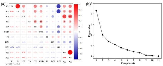(a) Correlation analysis of DOM components and various water−quality indices in the Wanggang River; (b) Eigenvalues of principal components of DOM components and water-quality indices in the Wanggang River.