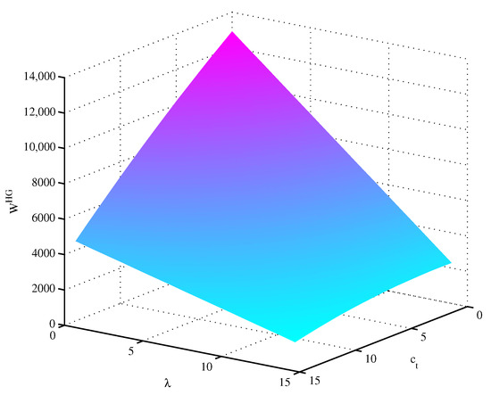 - Figure 3b shows that there exists an optimal value of to maximize W in all three models when , which are , , and . In different models, the optimal value of is influenced by the marginal social damage of carbon emissions and there exists a threshold value about . When exceeds the threshold, there exists an optimal value of to maximize social welfare; otherwise, social welfare will decrease as increases.
