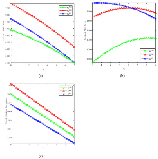- Figure 3c shows that in all three models, total carbon emission decreases as the unit carbon tax increase when . Total carbon emissions are the highest in the HG model, followed by the NG model and the lowest in the PC model. The government’s carbon tax on the retailer will reduce total carbon emissions, mitigating environmental pollution. Comparing Figure 3a, we can obtain a corresponding reduction in the total value of social welfare.