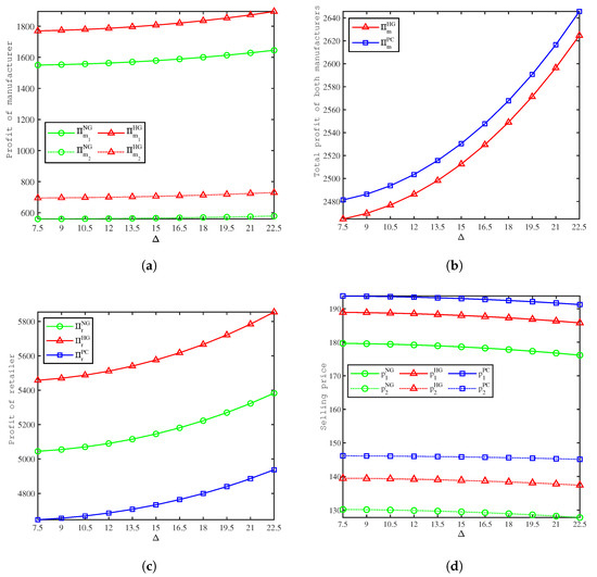 - Figure 4a shows that in the NG and HG models, the profits of both manufacturers increase as the unit cost savings from remanufacturing increase, and the profits of both manufacturers in the HG model are higher than those in the NG model. Consistent with Proposition 1, green marketing inputs by the retailer can lead to better profits for manufacturers. As unit cost savings from remanufacturing increase, the manufacturer’s total cost of production decreases, and the manufacturer is encouraged to increase recycling investments to improve recovery rates, thereby increasing profits.