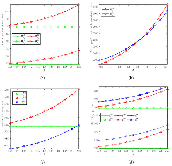 - Figure 5a shows that in the HG model, the profits of both manufacturers increase as the green marketing elasticity parameter of demand increases, and the profits of both manufacturers in the HG model are higher than those in the NG model. Consistent with Proposition 1, green marketing inputs by the retailer can lead to better profits for manufacturers. As the green marketing elasticity parameter of the demand increases, the gap between the two models increases.