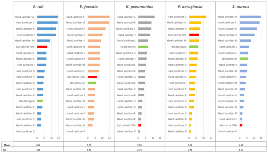 The hand sanitizers in this study were used in their original state by the manufacturer/producers (the alcohol concentrations were not modified). Sterility tests were carried out on all the hand sanitizers (A–R) and showed no microbial contamination. These results are reassuring and did not negatively influence the outcome of the experiments. Previous studies have not reported the sterility of the hand sanitizers before testing and hence is unique to this study. The sanitizers exhibited variable inhibitory activity against the bacterial strain, with zones of inhibition ranging from 1.5 mm to 14.94 mm at the manufacturer’s concentrations. In general, the current study results showed lower effectiveness of tested products with lower zones of inhibition than previously published [22,23,24]. The reduced effectiveness may be indicative of consumer demand and compromised manufacturing practices.