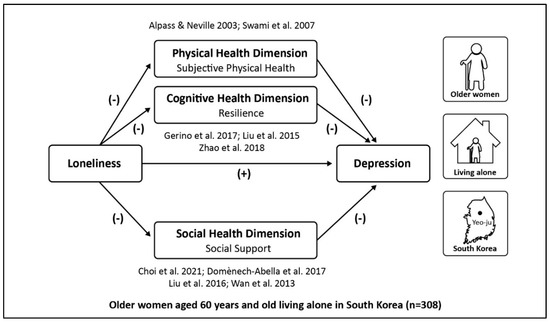 This study showed that loneliness was directly and indirectly associated with depression through its association with the subjective physical health, resilience, and social support for the older women living alone in Korea. By using three mediators (physical health, resilience, and social support) in the same model, this study attempted to comprehensively understand the mechanisms of the association between loneliness and depression among the elderly living alone. The findings suggest the importance of enhancing physical, cognitive, and social health as an effective cognitive-behavioral treatment for depression in older people, particularly older women, as a way to minimize the level of loneliness and prevent depression. This study’s results will help healthcare professionals to consider developing interventions to enhance physical health and social support in their programs that care for the mental health of the elderly women.