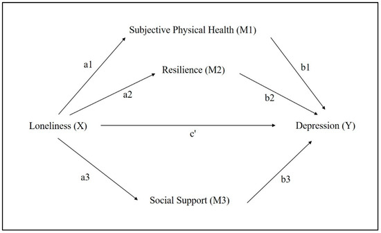 This study used a parallel mediation model, which is a basic mediation model from Hayes PROCESS templates, to examine the mediating effects and identify which and how variables among physical (subjective physical health), cognitive (resilience), and social (social support) dimension have the mediating effect on the association between loneliness and depression. These mediators are allowed to correlate with one another, but not to influence each other in causality [50]. Potential covariates, including age, religion, and duration of living alone, were included in the analysis to examine whether they affect the results or not [50]. However, age (b = 0.0024, p = 0.87), religion (b = 0.0632, p = 0.71), and living duration (b = 0.0006, p = 0.27) were not found to be statistically associated with the level of depression on the total effects model. Thus, we did not include them in the mediation model. Data analysis was performed by using the PROCESS function V2.1. in SPSS V.21. We hypothesized that loneliness (X) would indirectly affect depression (Y) through three mediators: subjective physical health (M1), resilience (M2), and social support (M3), respectively (Figure 2).