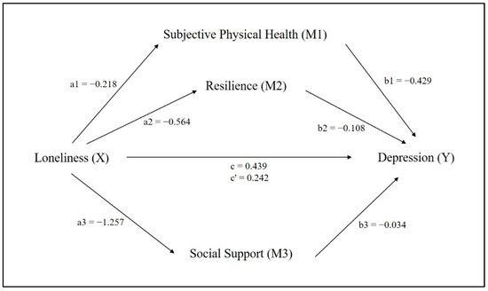 For direct effects, subjective physical health was regressed on loneliness (path a1) and the standardized coefficients reported here was −0.218, indicating that loneliness is negatively associated with subjective physical health (p < 0.0001). Resilience was regressed on loneliness (path a2) and the effect was significantly negative (b = −0.564). Social support was regressed on loneliness (path a3) and the standardized coefficient reported was −1.257, which means that loneliness was negatively predicted by social support. We found negative effects of subjective physical health (path b1, b = −0.429), resilience (path b2, b = −0.108), and social support (path b3, b = −0.034) on depression. All associations were statistically significant (p < 0.05). The direct effect (path c’) was explored by regressing depression on loneliness, which was 0.242 (p < 0.0001).