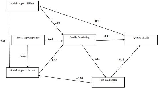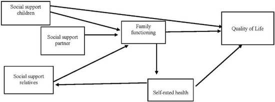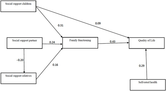 Relationships with partners are defined by a context of intimacy and based on commitment, emotional interdependence and affective reciprocity, meaning that partners play a central role in satisfying psychosocial needs in old age [42]. A study conducted by Ryan et al. [44] in the United States showed that perceived social support from a partner was associated with better self-assessed health and fewer functional limitations. Social support from a partner also positively affected QoL [29]. Our study hypothesized that social support from a partner would be associated with QoL not directly, but rather indirectly through family functioning. Previous studies suggest that support from a partner tends to be taken as a given, meaning that a positive influence on QoL should only be expected if the relationship with the partner involves effective and positive interactions [45,46].