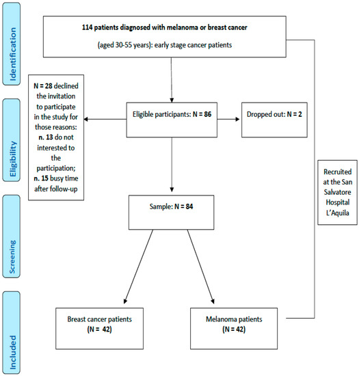 Participants were n = 84 female patients aged 30–55 years old (mean age 42.2, ±8.3), living in central Italy distributed in 2 groups: (a) Melanoma group (Mg) composed of n = 42 patients with melanoma diagnosis (Stage 0-II) and (b) Breast cancer group (Bg) composed of n = 42 patients with a breast cancer diagnosis (Stage 0-II). All patients had an early-stage diagnosis by early screening.